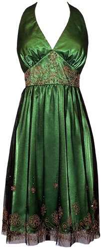 Gorgeous layered mesh over satin halter dress. Mesh is beaded and embellished with beautiful ribbon applique. Junior plus sizes XS-3X.