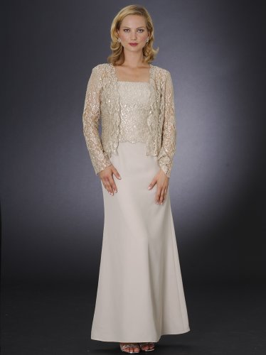 Stylish! 2 piece dress and jacket set. Tank dress with handbeaded lace bodice and aline chiffon skirt. Handbeaded lace illusion jacket with front closure. FIT TIP: This style is form fitted. Use bust, waist and hip measurements to determine fit. Sizes run