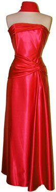 Stunning strapless satin gown with twist detailing, boned bodice, matching chiffon scarf, back zip, junior sizes X-small to junior plus size 5X.