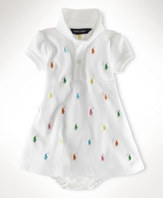 A preppy short-sleeved polo dress is playful for baby with allover colorful, embroidered ponies.     A first-time favorite by Ralph Lauren.