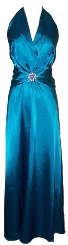 Sexy long satin halter dress with rhinestone pin accent at waist, matching chiffon scarf, zip back. Great for prom, bridesmaid, homecoming, evening gown or formal. Junior sizes XS-3X.