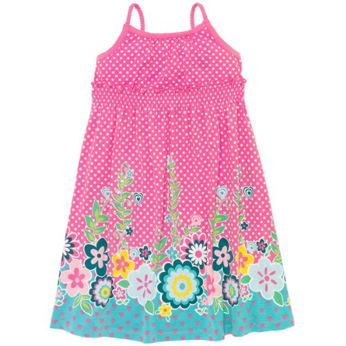 Polka dots, flowers and a flowy skirt -- a great warm-weather dress for any fashion girl![*-Our ultra-soft polyester jersey with a touch of spandex for a bit of stretch*-Pullover style with braided shoulder straps*-Slightly gathered at the chest; elasticized smocking at empire waist for a fashionable fit*-Polka dots throughout with specially engineered floral border-print artwork at the bottom*-Designed in a below-the-knee style. Note: size chart below provides specific length measurements *-Tagless label for itch-free comfort*-Imported]