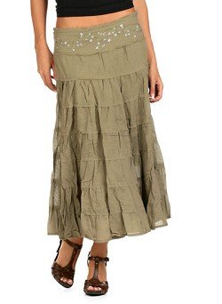 Silver threading and tone-on-tone floral embroidery accents the waist of this multi-tiered skirt. Two layers of gauzy cotton creates a flowy and feminine silhouette. Side zip. 29" long. Machine wash warm.
