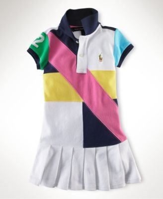 An adorably sporty color-blocked polo dress rendered in breathable and durable stretch cotton mesh. A favorite look by Ralph Lauren.