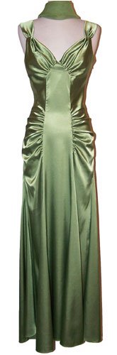 Stunning one-way light stretch satin gown with gorgeous ruching in front and back, matching chiffon scarf. Junior sizes S-3X.