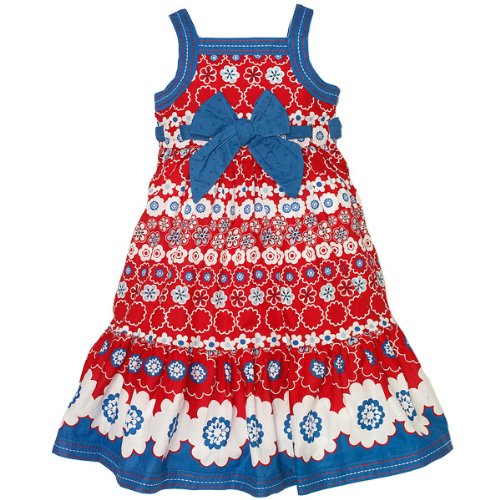 She can twirl till her heart's content in this adorable floral favorite in red, white and blue![*-Made of 100% cotton voile *-Pre-washed for softness and to reduce shrinkage *-Square neckline trimmed in blue piecing with red and white decorative stitching*-Side zipper hidden in seam*-Smocked back bodice with pre-tied swiss dot sash at empire waist*-Wide sweeping skirt fully lined in cotton voile for maximum twirl factor!*-One wide tier at the bottom of skirt with small pin-tucks creates a country-cute appeal*-Imported]
