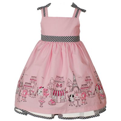Bring Paris home with you in this gorgeous dress by Rare Editions. Perfect for your infant, toddler and little girl. Features great print composed of Paris city scape. This sleeveless dress has black plaid sash at waist and bows at shoulder. Back button closure. Attached tulle underskirt. Tres Chic pour votre pettite fille!