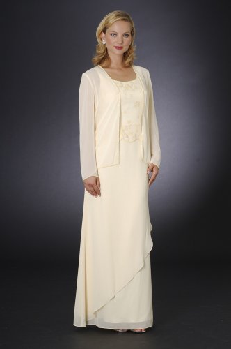 Simply Gorgeous! Chiffon 2piece evening set with handbeaded tank dress and jacket with border of beads. Aline skirt with chiffon cascade.FIT TIP: This style is form fitted. Use bust, waist and hip measurements to determine fit. Sizes run small. See body m
