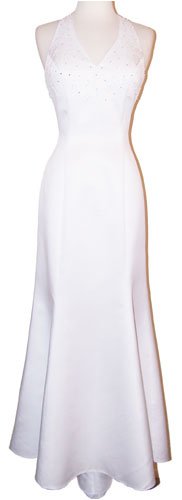 Stunning gown is fully lined with built-in cups, beadwork goes from the back of the neck over the bust and around the sides where it fans out down to the bottom of the train. Center back zipper. Sizes XS-3X.