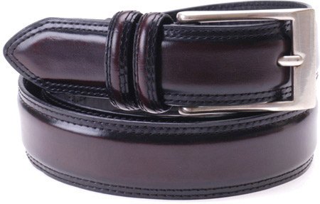 1.26" full grain high shine burnished leather belt with two loops. Silver plated buckle.
