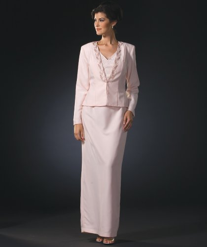 Simply Stunning! Satin-backed crepe tank dress with medium length jacket. Multi-tonal handbeading on jacket and dress. Slight Aline skirt.FIT TIP: This style is form fitted. Use bust, waist and hip measurements to determine fit. Sizes run small. See body