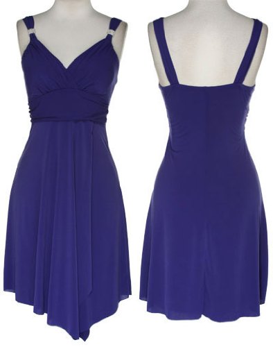 La Belle stretch dancing dress has sash straps detailed with rhinestones encrusted brooches. The surplice bust is slightly gathered and lightly padded for shape. A ruched band accents the empire waist in front. The wrap style skirt drops down to a handkerchief cut bottom hem. This dress is lined at the bust.