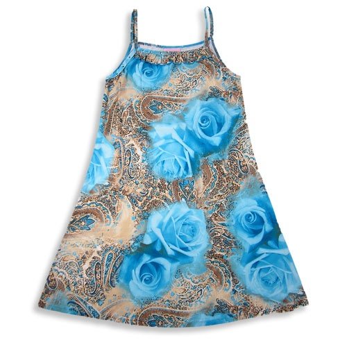 Lipstik Girls - Girls Dress, Brown, Turquoise, Sundress, Spaghetti Straps with Rhinestones, Ruffling at Neck, Large Rose and Paisley Print, 100% Polyester, #10604