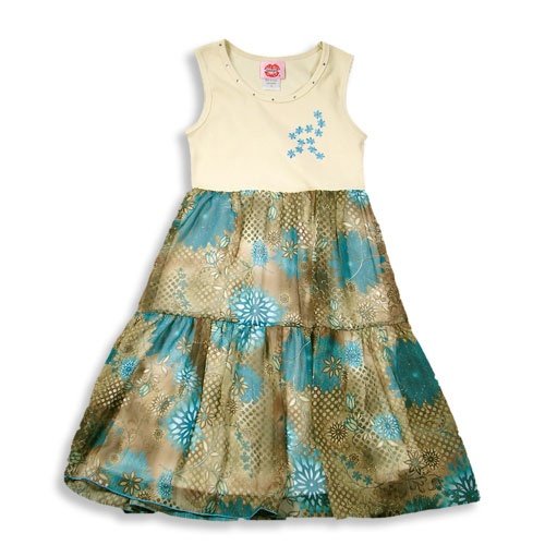 Lipstik Girls - Girls Dress, Cr?me, Brown, Turquoise, Ribbed Tank Top with Embroidered Flowers and Rhinestones Around Neckline, Printed Mesh Overlay Skirt, 65% Polyester, 35% Cotton, #10602