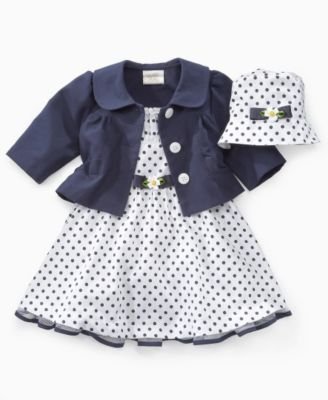 Give your little lady a very smart look with this adorable polka dot dress and coat set featuring a matching hat from Little Bitty!