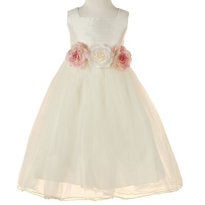 Make memories as special as she is with style that never goes out of fashion. In a classic color, this sumptuous dress features a duppioni silk bodice, tie backs and tulle skirt with three elegant matching flower pins on the waist. Shirring at the waist creates extra volume in the skirt, enhanced by tulle underneath for added flounce. Made with a full lining for comfort and an invisible back zipper for easy dressing.