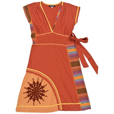 This is a Long Crochet Patch Dress by Jedzebel with cap sleeves.  It comes in brown, pomegranate, and apricot and is sized S/M/L.  It is adorned with a flower motif crochet patch.