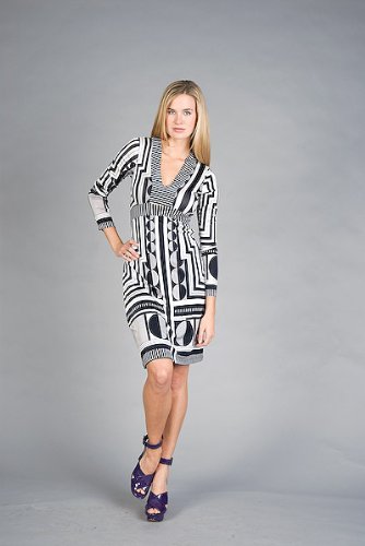 This stunning black and white dress by Custo Barcelona has a deep v-neckline and 3/4 sleeves. The empire waist elongates your torso for a slim, tall look. The optical geometric print and comfortable knee length make this dress perfect for a variety o