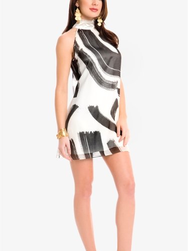 Sweeping strokes of color give the feeling that you're wearing a piece of fine art, beautifully crafted just for you. Trapeze style with tie at the nape of the neck. Daringly short for daring style. 100% silk Professionally clean