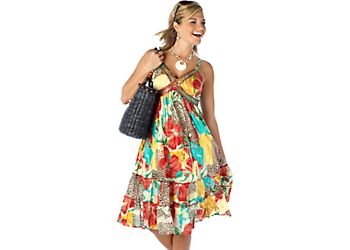 A fun & flirty style by Lola P!  This dress features a crinkled fabrication, vibrant floral print, tiered design, smocked detail at the back, and a sequin bodice.  41" in length from high point of the shoulder.  A fashionable dress that provides a flattering fit! Cotton.