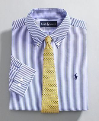 Get the essentials. This classic oxford shirt is crafted in fine cotton using single needle stitching for a refined feel. Features fitted armholes and tapered torso for a more athletic fit. With allover stripe, embroidered logo at left chest and single button cuff. Round hem.