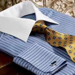 Tailored of soft, lustrous 100s two-ply cotton with a touch of satin for subtle  sheen and elegance. White edge-stitched English spread collar and mitered Frenc h cuffs. Imported. Machine Wash. This fabric is also available as custom shirt n umber MHC0350. Note: Add an additional $5.00 for Big and Tall Sizing.(Big and Tall sizes include: 18, 18.5, 19, 20 collar sizes and any 37 \ 38 inch sleeve lengths)