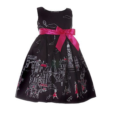 Bring Paris home with you in this gorgeous dress by Rare Editions. Perfect for your toddler and little girl. Features great  print composed of Paris city scape. This sleeveless dress has hot pink sash and bow at waist. Back zipper closure. Attached tulle underskirt. Tres Chic pour votre pettite fille!