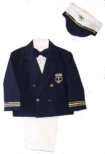 Complete 5-Pc Boys Sailor Suit, Nautical Outfit with fully lined Navy Blue Captain's Blazer, White Dress Slacks, Long-Sleeved Dress Shirt, Navy Blue Clip-on Bowtie, Adorable Captain's Hat.