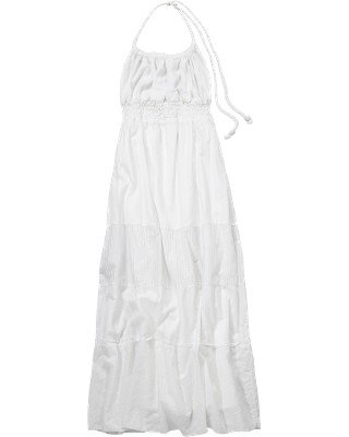 Online exclusive! Splurge on yourself and max out some cards! Rip Curl maxi dress features solid white design with tiered accent patterns along bottom and flower details along top. Halter top with rope ties and cinched elastic center area. Small embroidered logo on hip.